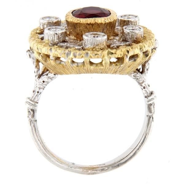 Anello in oro giallo e gambo in oro bianco 18Kt con rubino naturale di ct 1,30 e sei diamanti naturali taglio brillante - Peso gr 10,80 - Misura testa dell'anello cm 1,8x2,2 - Cesellato a mano - Epoca: primi novecento