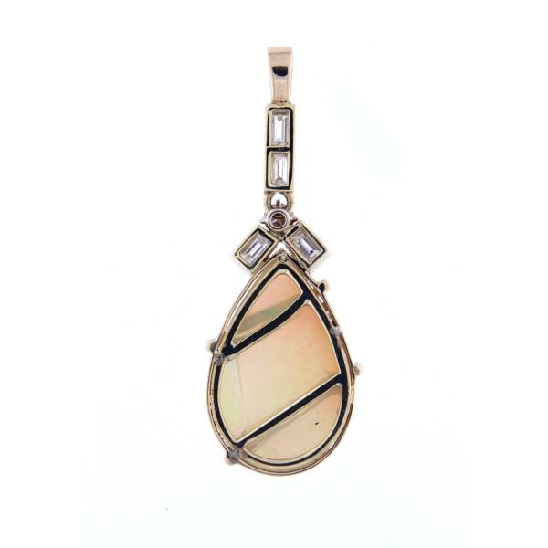Pendente in oro 18 kt con diamanti e opale, peso totale 8.30 grammi Un diamante taglio brillante ct 0.15 colore G, purezza VVS e 4 diamanti taglio baguette per complessivi ct 0,85 circa, colore G, purezza VVS, opale taglio goccia cm. 2.30 x 1.50 peso approssimato 9 ct.
